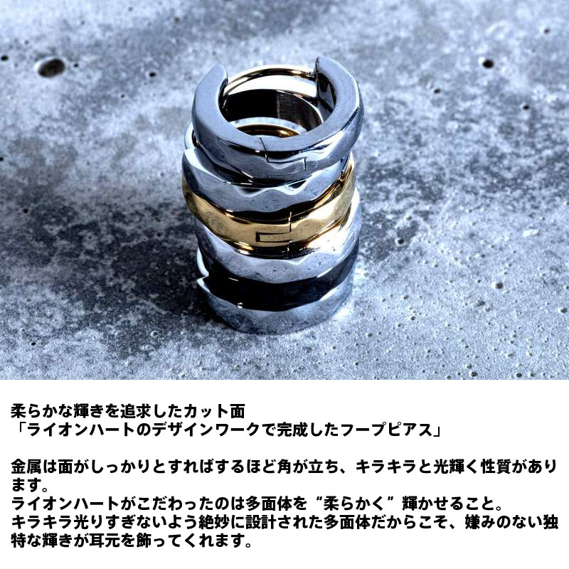 ライオンハート LION HEART カッティング フープピアス サージカルステンレス ゴールドライオンハート LION HEART カッティング フープピアス サージカルステンレス シルバーライオンハート LION HEART カッティング フープピアス サージカルステンレス ブラックライオンハート LION HEART カッティング フープピアス サージカルステンレス コンビネーションライオンハート LION HEART カッティング フープピアス シルバー925 ブラックライオンハート LION HEART カッティング フープピアス シルバー925 シルバーライオンハート カッティング フープピアス シルバー925 MIX ブラック&シルバーライオンハート LION HEART 有料BOX サイズSライオンハート LION HEART 有料BOX サイズL【品名】ライオンハート LION HEART カッティング フープピアス シルバー925 シルバー メンズ ブランドシルバー素材が持つ魅力を最大限に表現したフープピアス【カッティングフープピアス】Silver925がもつ金属の輝きを最大限活かしたデザインで、表面のカッティングにこだわったフープピアス。