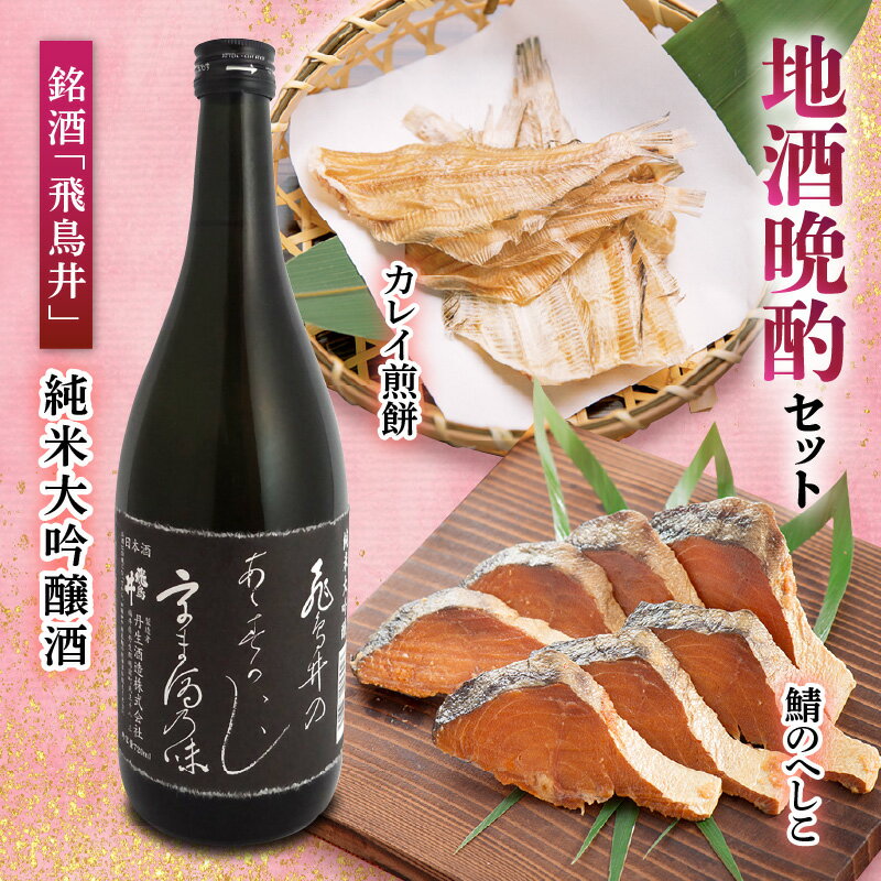 銘酒「飛鳥井」純米大吟醸、郷土料理「鯖のへしこ」、無添加「カレイ煎餅」の3種をお届け。