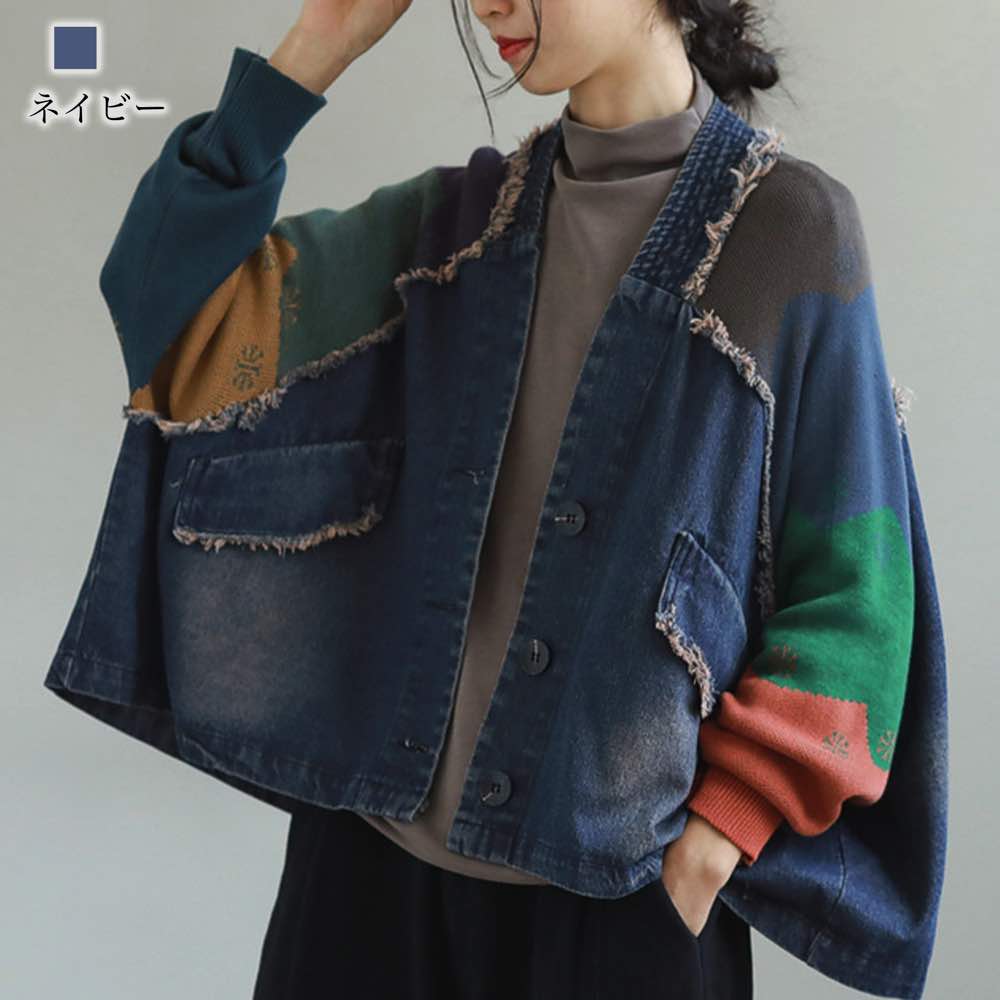 【商品名】異素材デニムカーディガン【カラー】ブラック ネイビー【サイズ】free【サイズ表記】・freeサイズ:着丈53-64 身幅166【素材】コットンブレンド【季節】コットンブレンド【スタッフコメント】デニムとニットの異素材の組み合わせで、お洒落たっぷり詰まったビッグカーディガン。