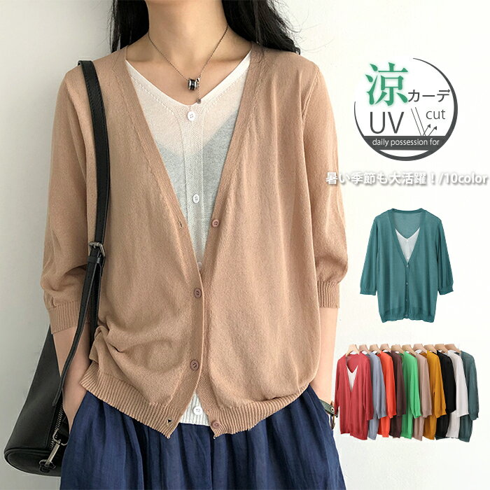 カーディガン 春 夏 サマーニット レディース ニット トップス シェルボタン Vネック UV 紫外線 対策 接触冷感 ひんやり素材 涼しい 長袖 薄手 カジュアル 体型カバー 細見え 無地 着回し